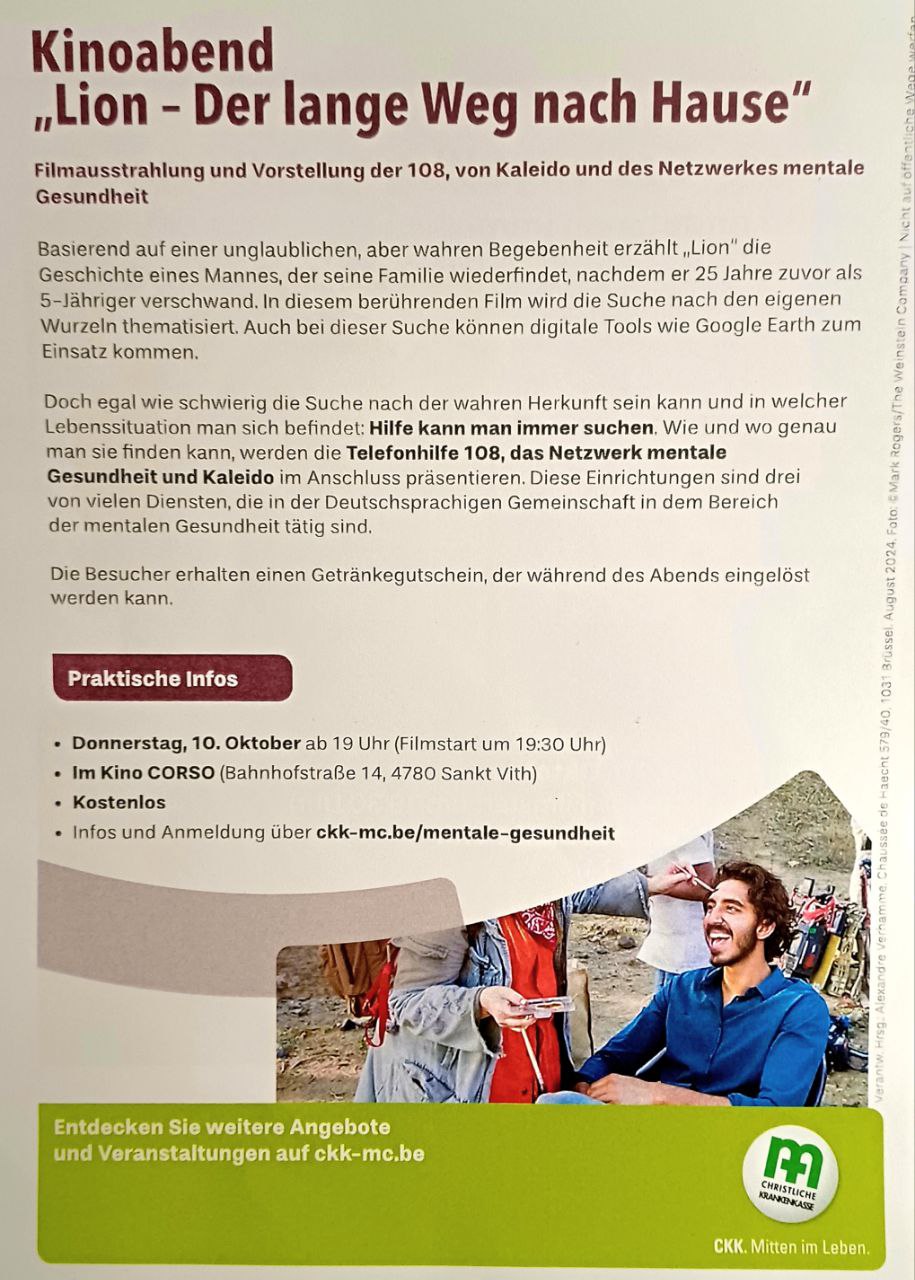 Anmeldung ist auch beim Film-Veranstalter erforderlich, und zwar hier auf der Seite der CKK (https://www.ckk-mc.be/dienste-projekte/woche-mentale-gesundheit#kinoabend).